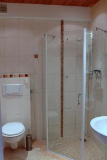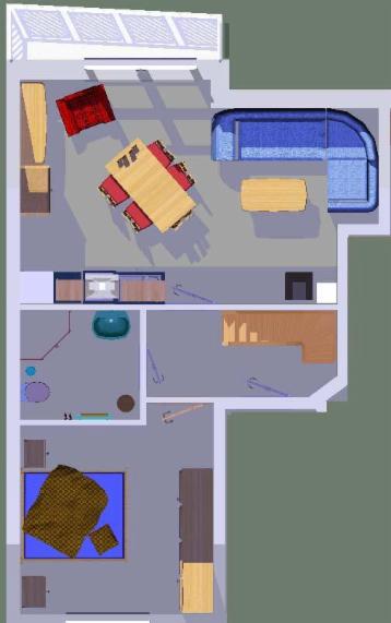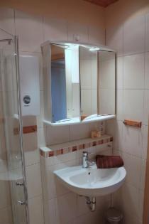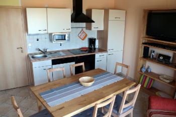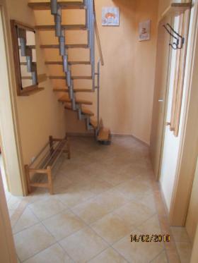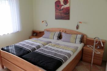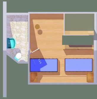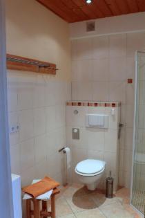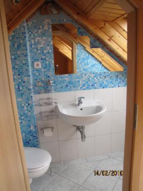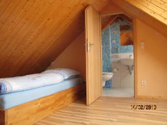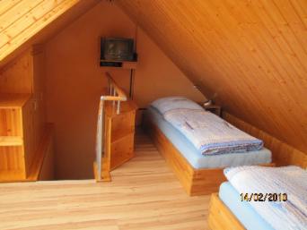 Spitzboden mit zwei Betten (0,90m x 2,00m), 2 Konsolen, 2 Hocker, Einbauschrank, TV mit SAT- Empfänger, DVD- Player, 2 Dachfenster mit elektrischen Rollläden; Toilette mit Waschbecken und Spiegel.