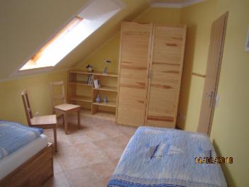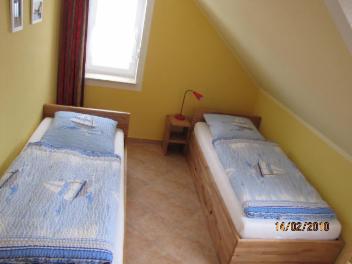 Schlafzimmermit 2 Einzelbetten (2,00m x 0,90m), 2 Nachtkonsolen, 2 Stühle, Kleiderschrank (2Türen), Regal, TV mit SAT- Reciver, DVD- Player.